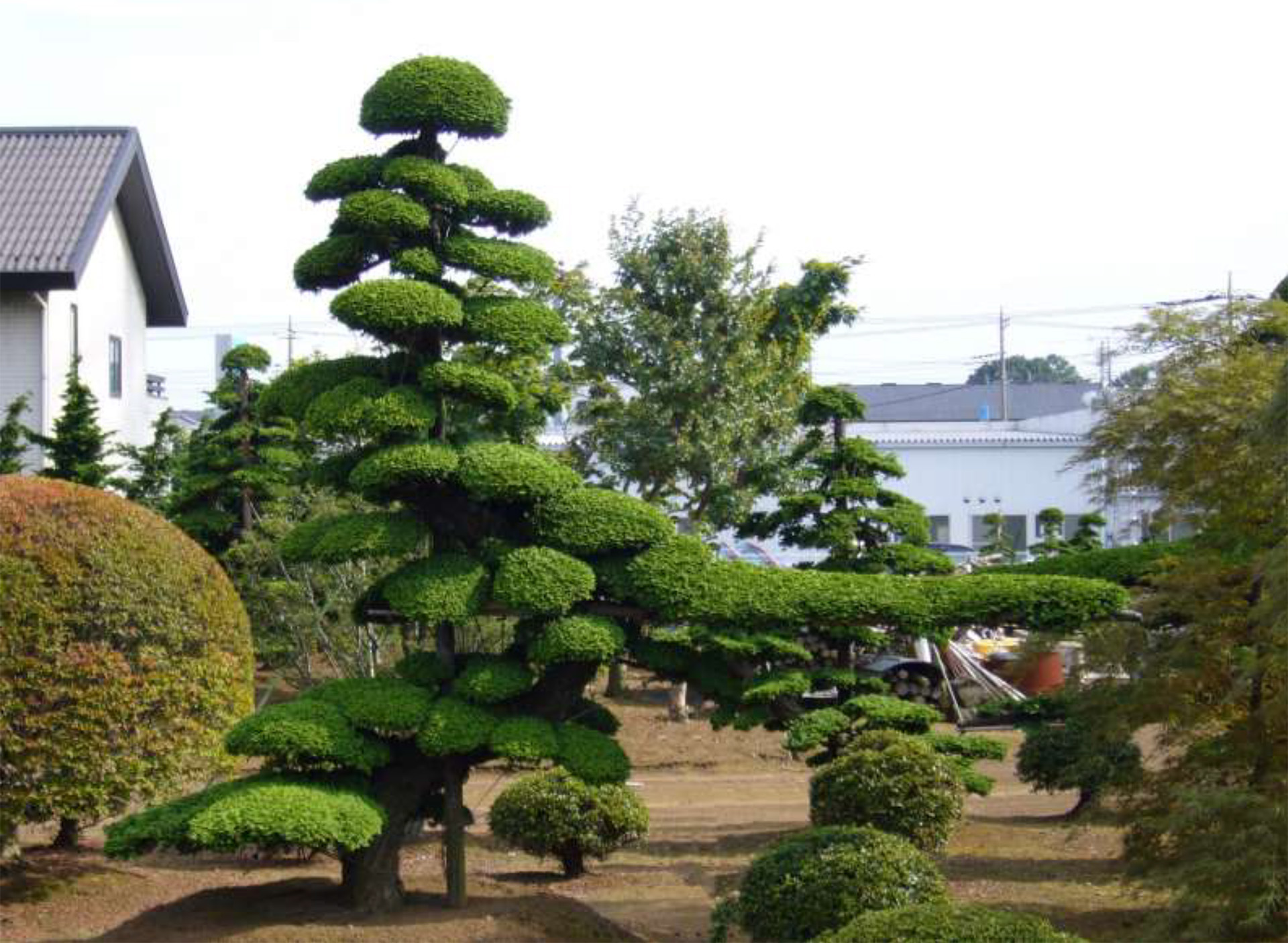 チャボヒバの幹を特殊なノミを用いて根本から上部まで4等分に割って芯を抜き、3人がかりで幹を曲げていく。曲幹(きょっかん)仕立てという安行の代表的な技術で、その後10年ほど手入れをし、割かれた幹が太り癒合して完成します。